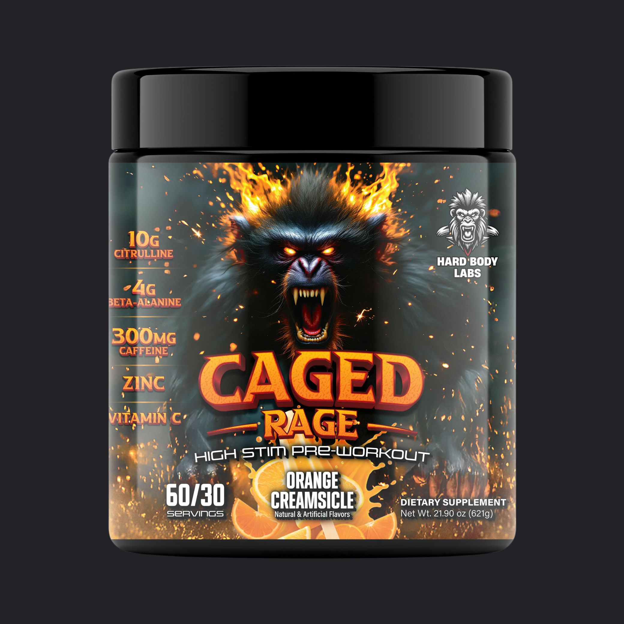 Fuel your inner fire with CAGED RAGE – Orange Creamsicle, the high-stimulant pre-workout from Hard Body Labs that hits like a beast uncaged. Packed with 10g Citrulline, 4g Beta-Alanine, and a clean 300mg Caffeine kick, this formula is made for lifters who don’t hold back.